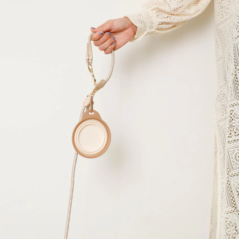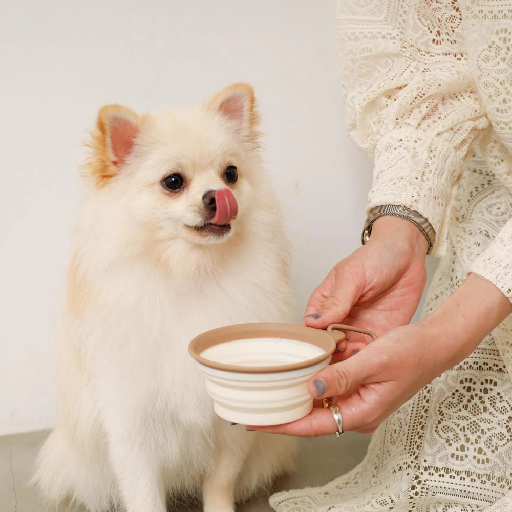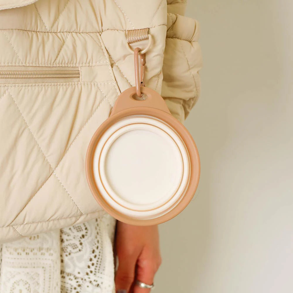 A lightweight, foldable silicone food bowl with hook — perfect for walks, travel, and outdoor adventures.