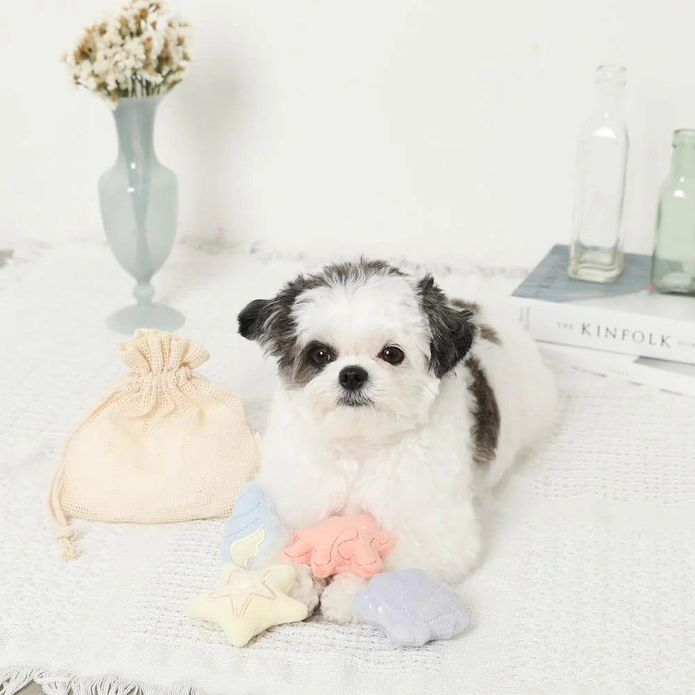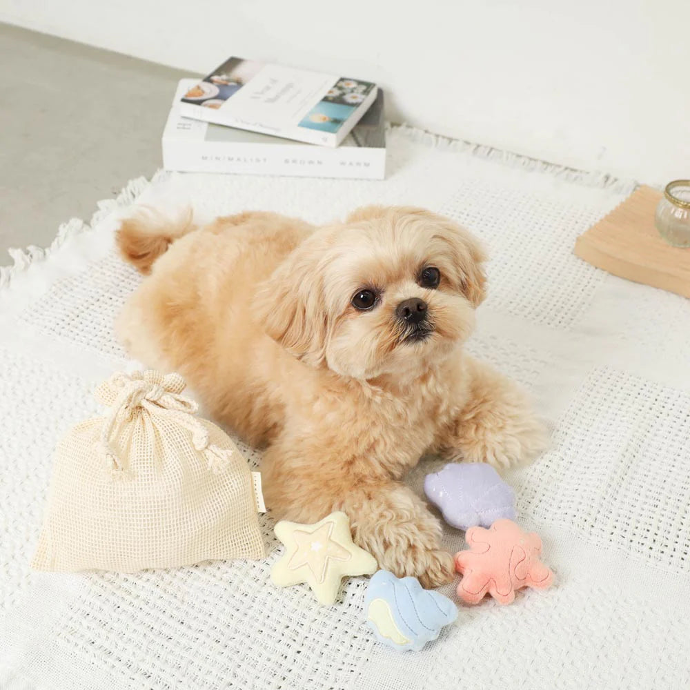 A playful shell-themed nosework toy set with squeakers and crinkle sounds — complete with a cotton drawstring bag for tidy storage.