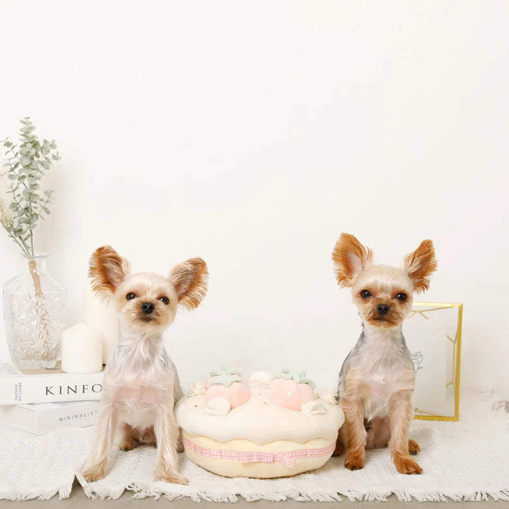 A playful strawberry cake-inspired nosework toy with detachable squeaky strawberries — perfect for hiding treats and stimulating your pup’s senses.